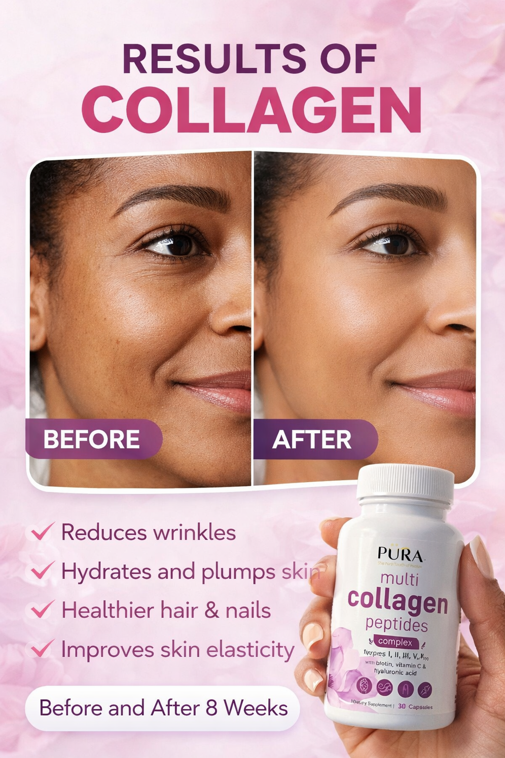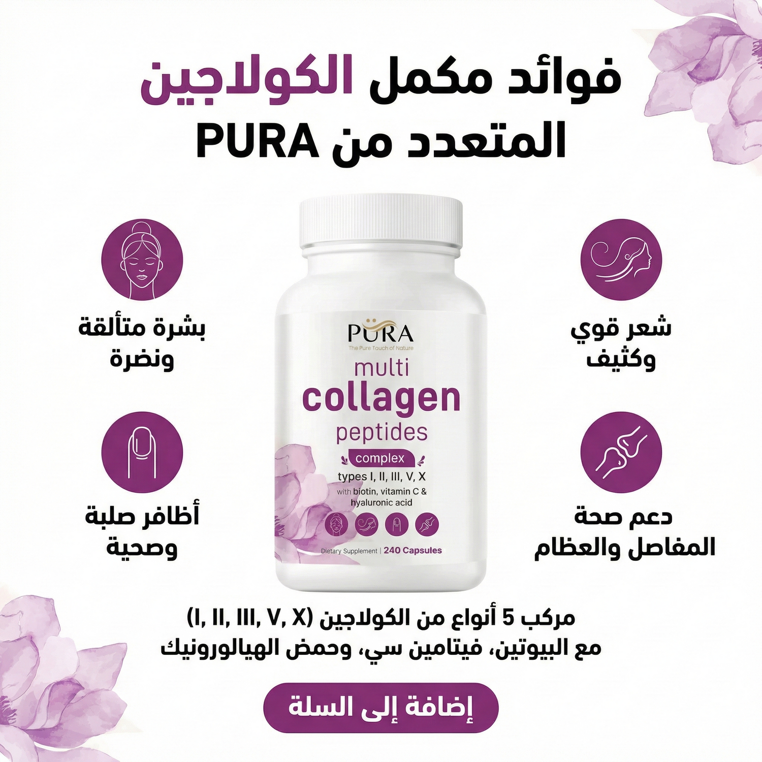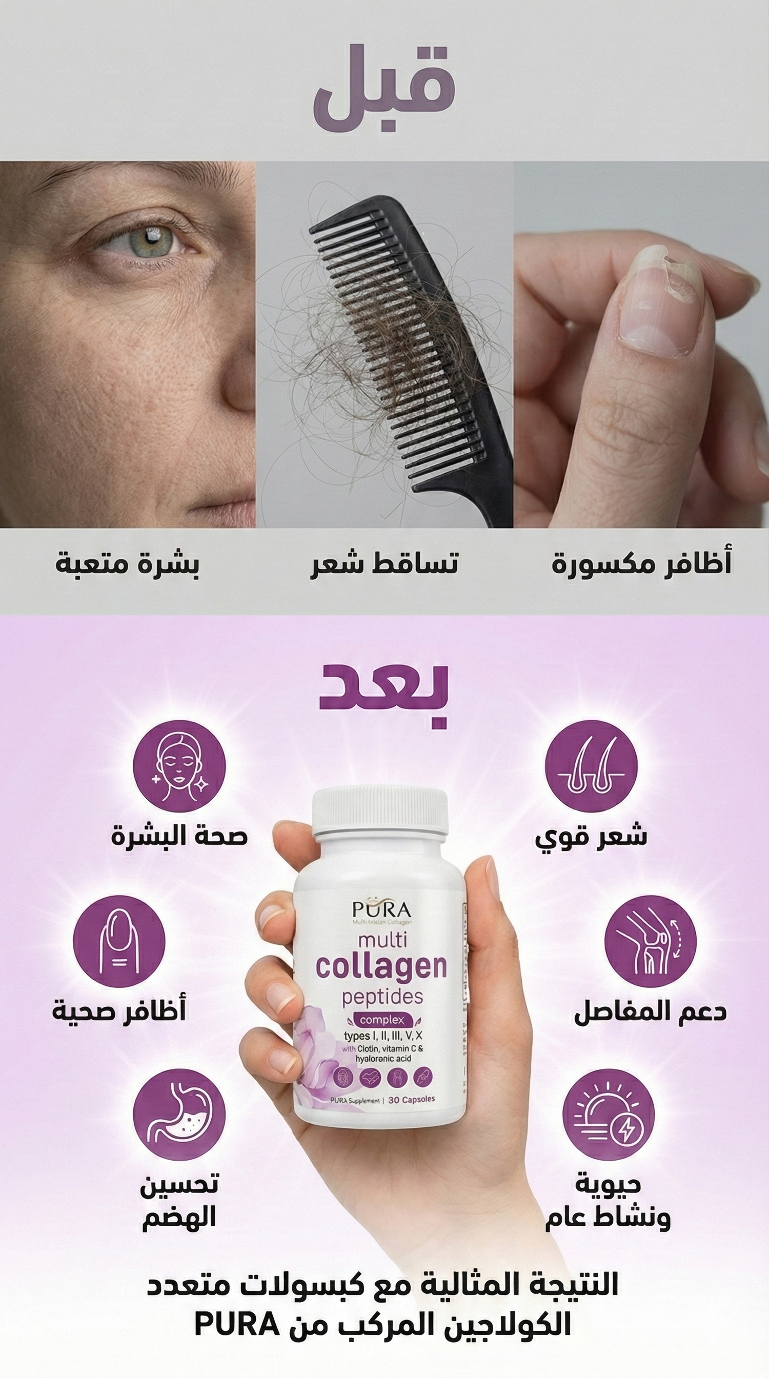 الدعم الشامل : يهدف مجمع الكولاجين الشامل إلى العناية بالشعر والبشرة والأظافر والمفاصل.