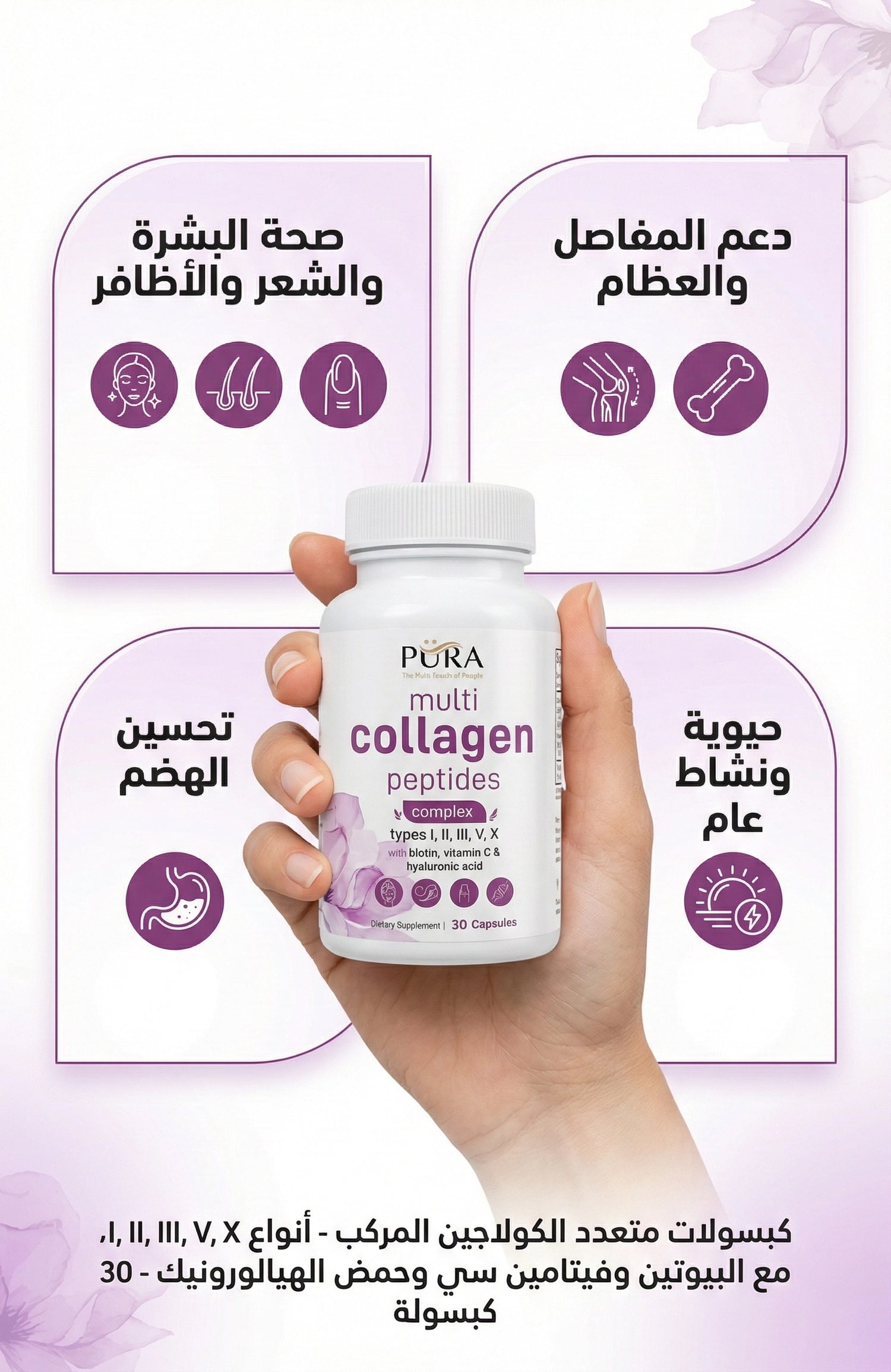 سر النضارة والحيوية مع هذه التركيبة المتطورة التي تجمع بين 5 أنواع من الكولاجين. مدعم بـ البيوتين، فيتامين سي، وحمض الهيالورونيك لضمان أقصى امتصاص ونتائج فعالة. كبسولة واحدة تمنحك بشرة مشدودة، شعراً أكثر كثافة، أظافر قوية، ومفاصل مرنة.